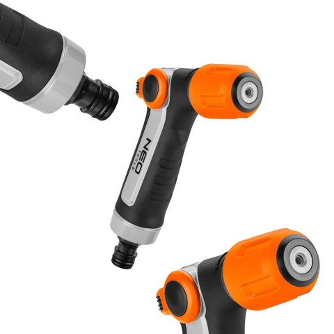 Zraszacz pistoletowy, 15-707, NEO, przeznaczony jest do nawadniania trawników, ogrodów i upraw. Wygodny zraszacz do trzymania w dłoni. Dlatego też ma ergonomiczny uchwyt, co ułatwia operowanie nim. Jest wyposażony w 2 funkcje podlewania, które pozwalają dopasować rodzaje strumienia do potrzeb. Ma również regulację siły strumienia. Na rączce znajduje się łatwo dostępny przycisk ON/OFF, który można obsługiwać kciukiem. Zraszacz wyróżnia się trwałą konstrukcją wewnętrzną wykonaną ze stopu cynku. Dostępne funkcje podlewania: silny strumień punktowy, rozproszony strumień „cyclone".