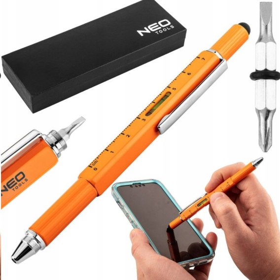 Wielozadaniowy długopis 5 w 1 od marki NEO to narzędzie niezbędne w wielu sytuacjach. Przeznaczony do pisania, mierzenia oraz wkręcania lub dokręcania małych elementów sprawdzi się w biurze, warsztacie, na budowie lub na uczelni. Składa się z: